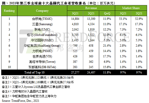研调机构 TrendForce 统计显示,第三季晶圆代工产值高达 272.8 亿美元,季增 11.8%,已连 9 季创历史新高。 台积电(TSMC)在苹果 iPhone新机发表带动下,第三季营收达148.8亿美元,季增11.9%,稳居全球第一;台积电(TSMC)在苹果 iPhone新机发表带动下,第三季营收达148.8亿美元,季增11.9%,稳居全球第一;联电(UMC)受到28/22nm扩增产能陆续开出,带动OLED driver IC等投片持续增加、均价上涨等有利因素驱动下,第三季营收20.4亿美元;格芯第三季营收达17.1亿美元,季增12%,位居第四名;排名第五的中芯国际(SMIC)受惠于PMIC、Wi-Fi、MCU、RF等产品需求稳定,以及持续调涨晶圆价格等因素,第三季营收达14.2亿美元,季增5.3%。值得注意的是,中国国内客户占比逐季提高,第三季中国客户占比已达近7成。